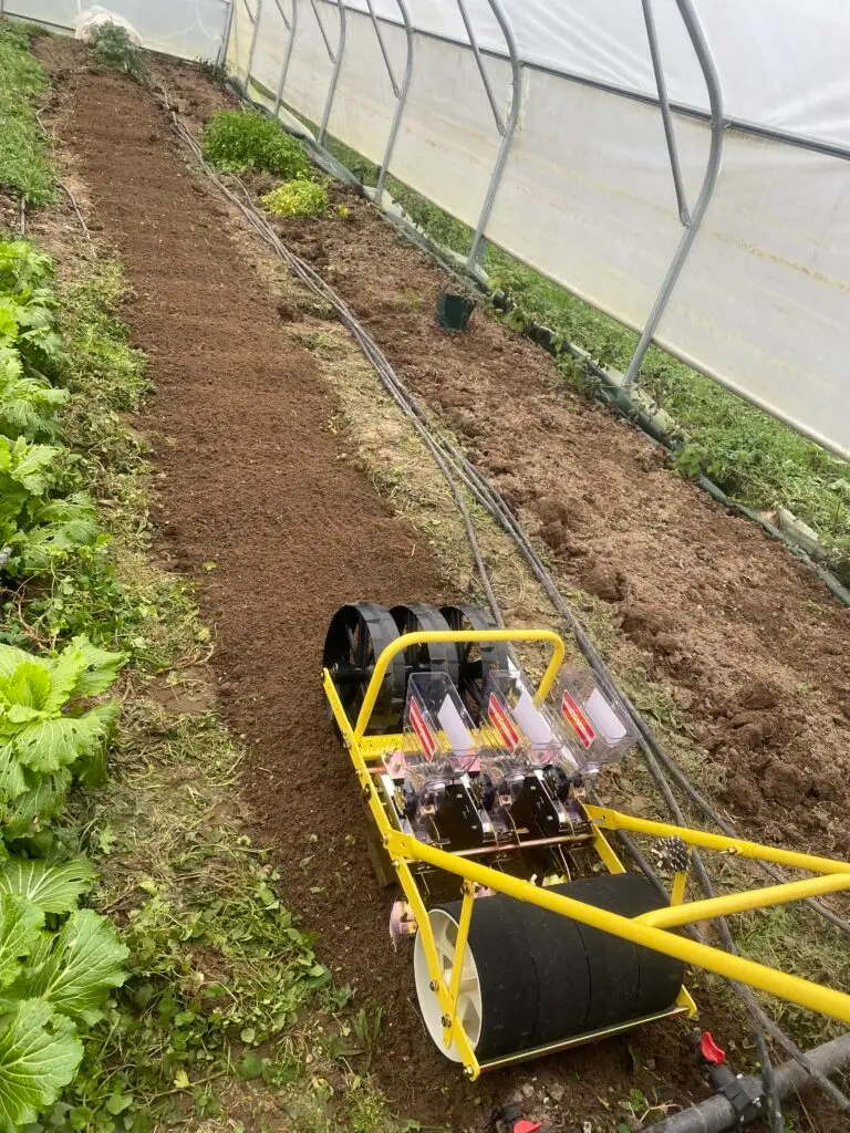 Cette semaine, du 19 au 25 janvier 2026, j’ai enfin pu démarrer les semis directs sous la serre, avec mon nouveau semoir manuel Jang ! Quel plaisir de mettre ce bel outil en œuvre : il me permet de semer sur trois rangs simultanément, voire sur trois rangs doubles pour les légumes qui aiment la densité, comme les radis ou les carottes.